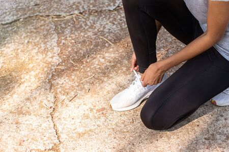 Legs Of Female Runner Adjusting Shoelaces On Running Shoe Close Up Of Feet Of Young Woman Tying Laces On Her Sneaker She Is Canstock