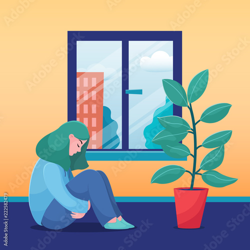Sad Unhappy Teenage Girl Young Woman Sitting At Home Alone Sunny Weather In The Window Flat Vector Illustration Depressed Sad Unhappy Girl Woman Sitting Home Alone Feeling Lonely Stock Vector Adobe