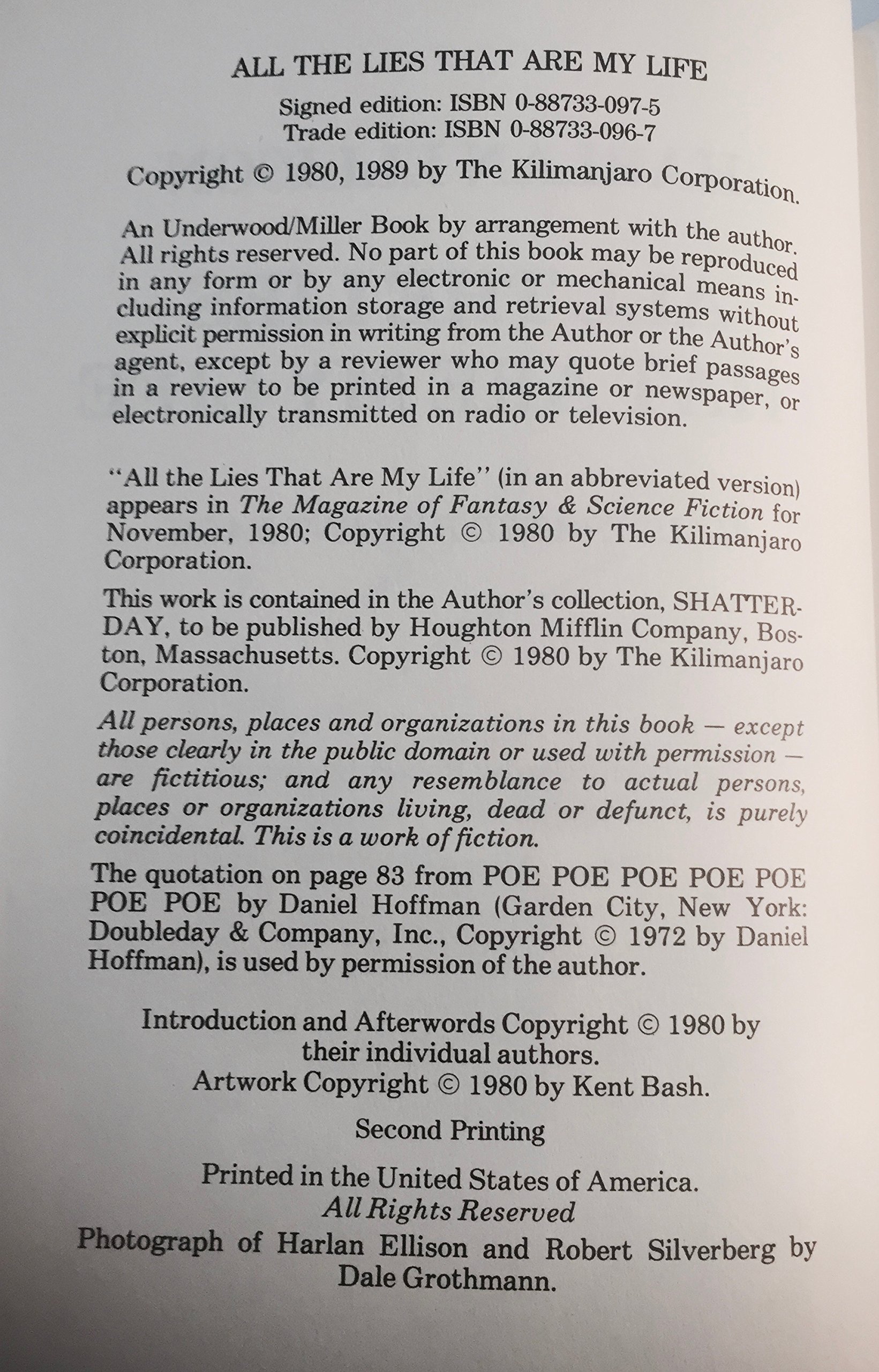 All the Lies That Are My Life Quotes by Harlan Ellison. Title Date AuthorEditor PublisherPub. Lancaster Pennsylvania 1989.