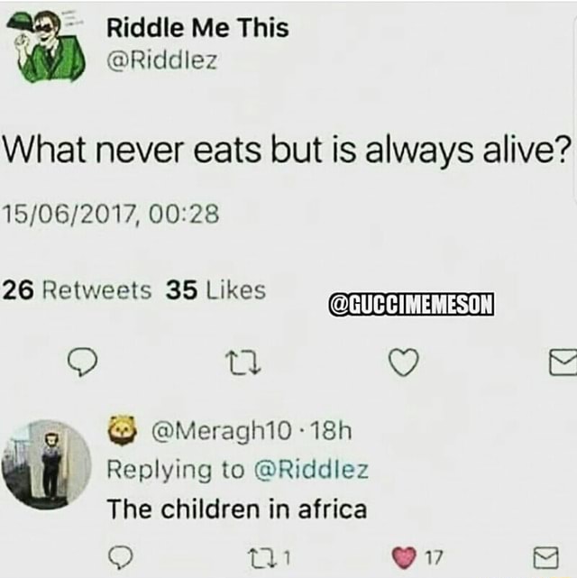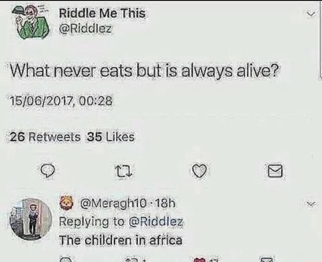 Riddle Me This Riddlez What Never Eats But Is Always Alive 15 06 2017 0028 26 Retweets 35 Likes Meragh10 18h Replying To Riddlez The Children In Africa 雙17 Daily Lol Pics