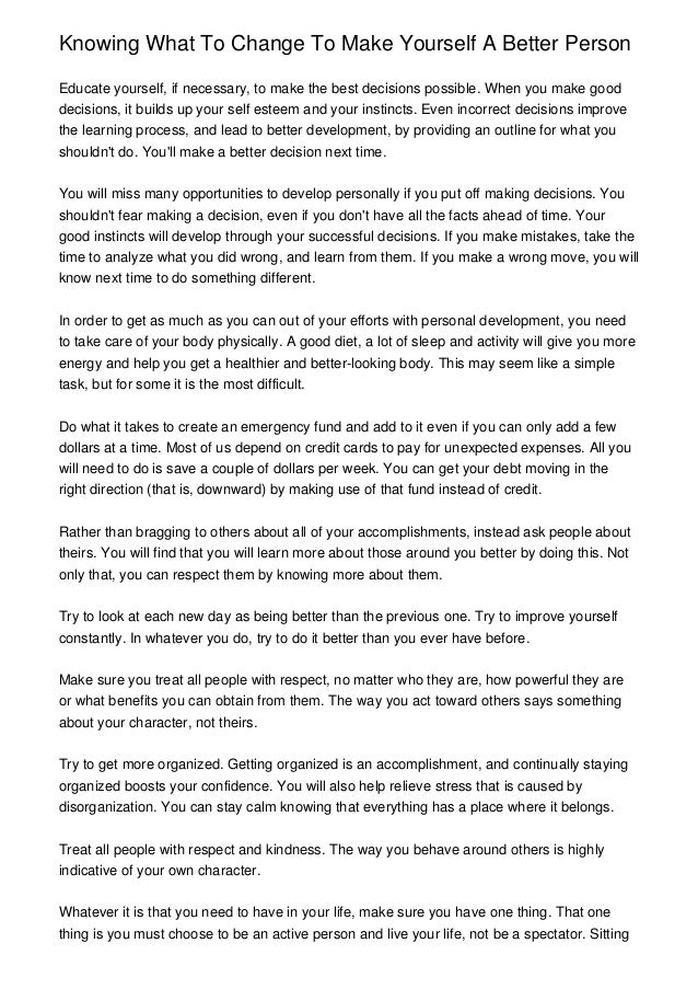 Try to mix it up by doing different exercises each day to prevent boredom and muscle strain. I would have never. The 7 ways on how to make yourself a better person is quite practical and a common-sense approach for self-improvement.