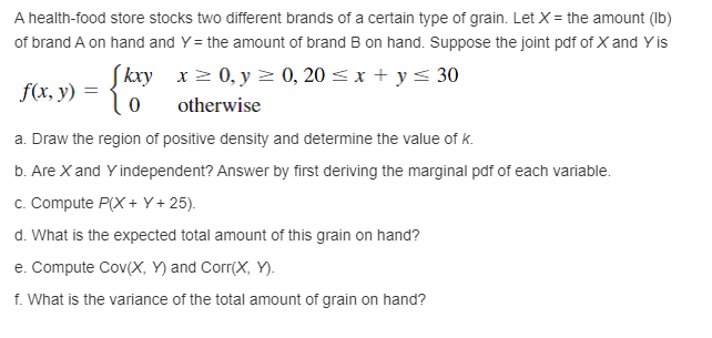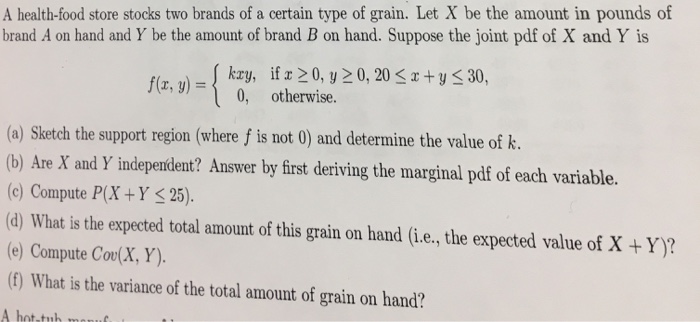 Let X the amount lb of brand A on hand and Y the amount of brand B on hand. Suppose the joint pdf of X and Y is. A health-food store stocks two different brands of a certain type of grain.